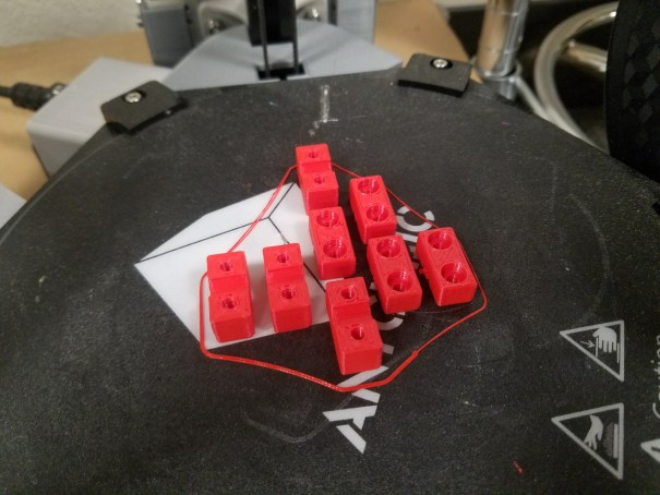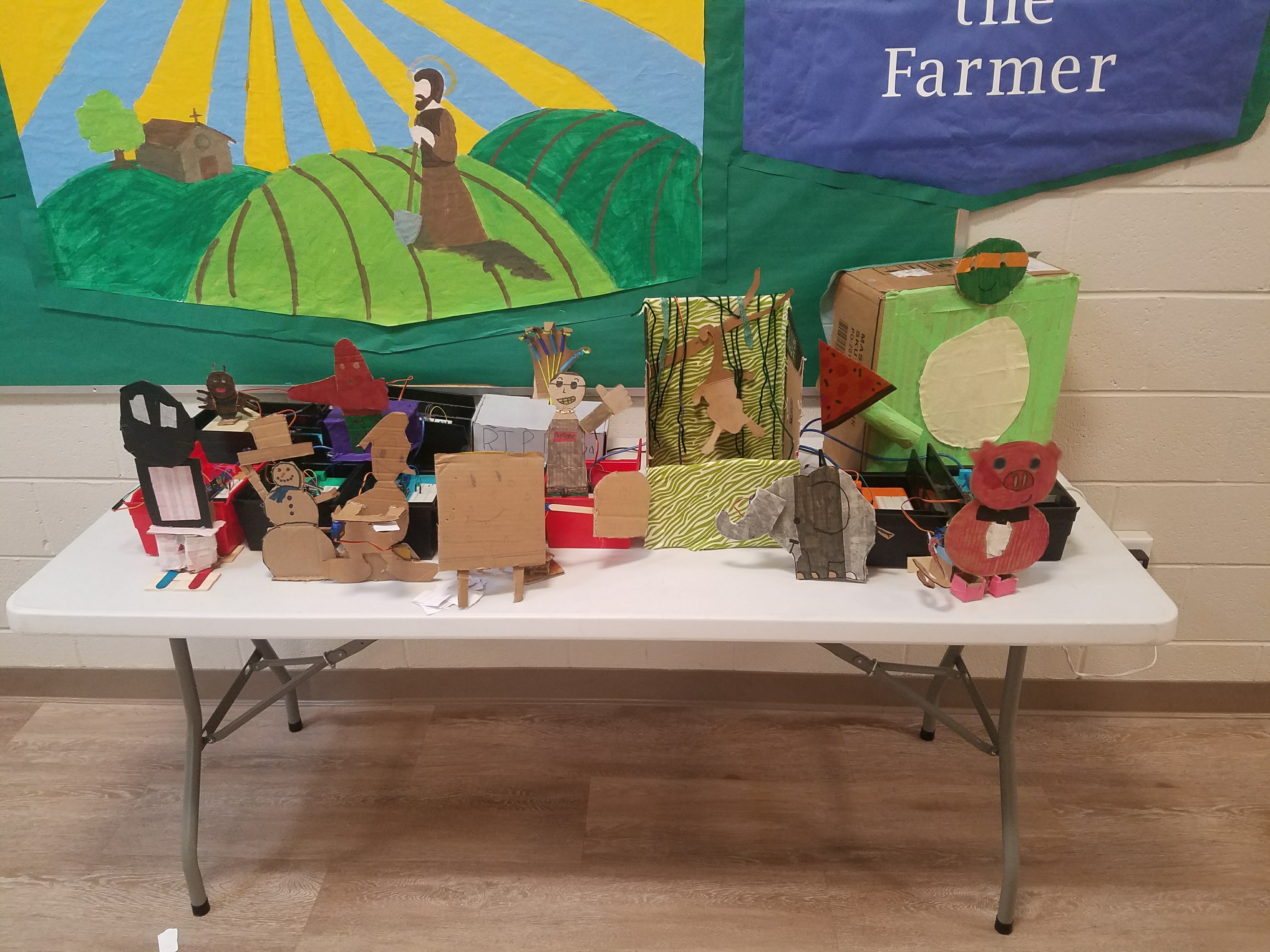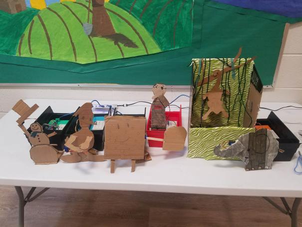 The boards have worked great so far and the students haven’t managed to break any! I also purchased some 7″ x 12″ x 4″ Plastic Conductive Shelf Bins from Uline to store each group’s Arduino, jumper wires, LEDs, and servos they are using. This lets them throw everything together at the end of class and not have to worry about parts being smashed. You can see some of the bins behind their Robot Petting Zoo projects below: