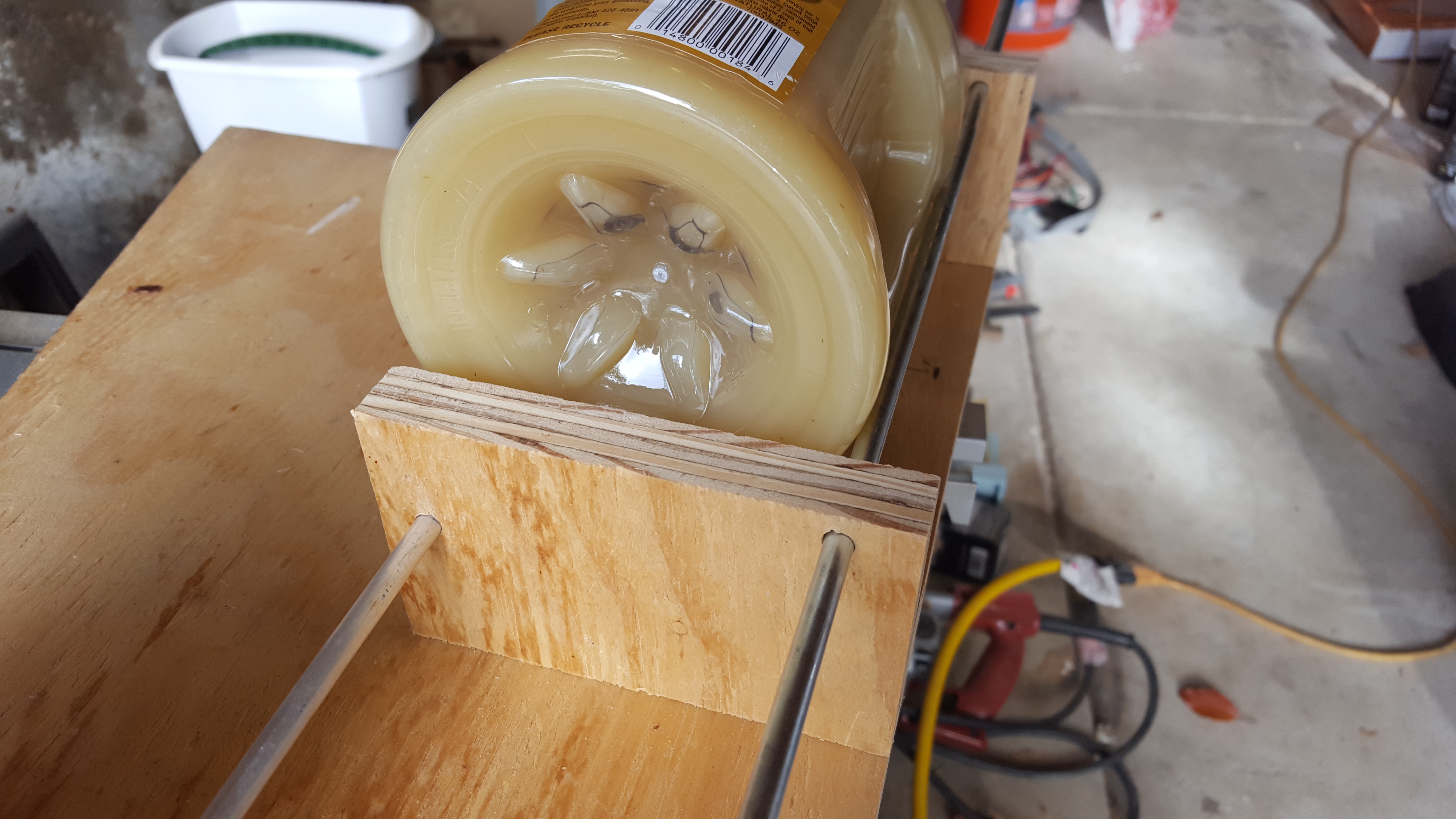 The rods spun freely on their plastic bearings and I drilled a 1/4″ hole in the center of the ABS pipe cap to use as the pulley. For extra support I also drilled a 1/4″ hole in a piece of plywood and glued that onto the cap. This plywood support got a hole drilled in the side and through the steel rod so I could insert a screw and hold all three pieces together. With a fully loaded apple sauce container, turning the ABS pulley didn’t do anything except spin the rod underneath it since the zinc plating was so slick. I tried wrapping some rubber splicing tape around the rod, and that did work, but only for an hour or so. After that, the tape began to wear off so I tried silicone tape and that seems to hold up much better.