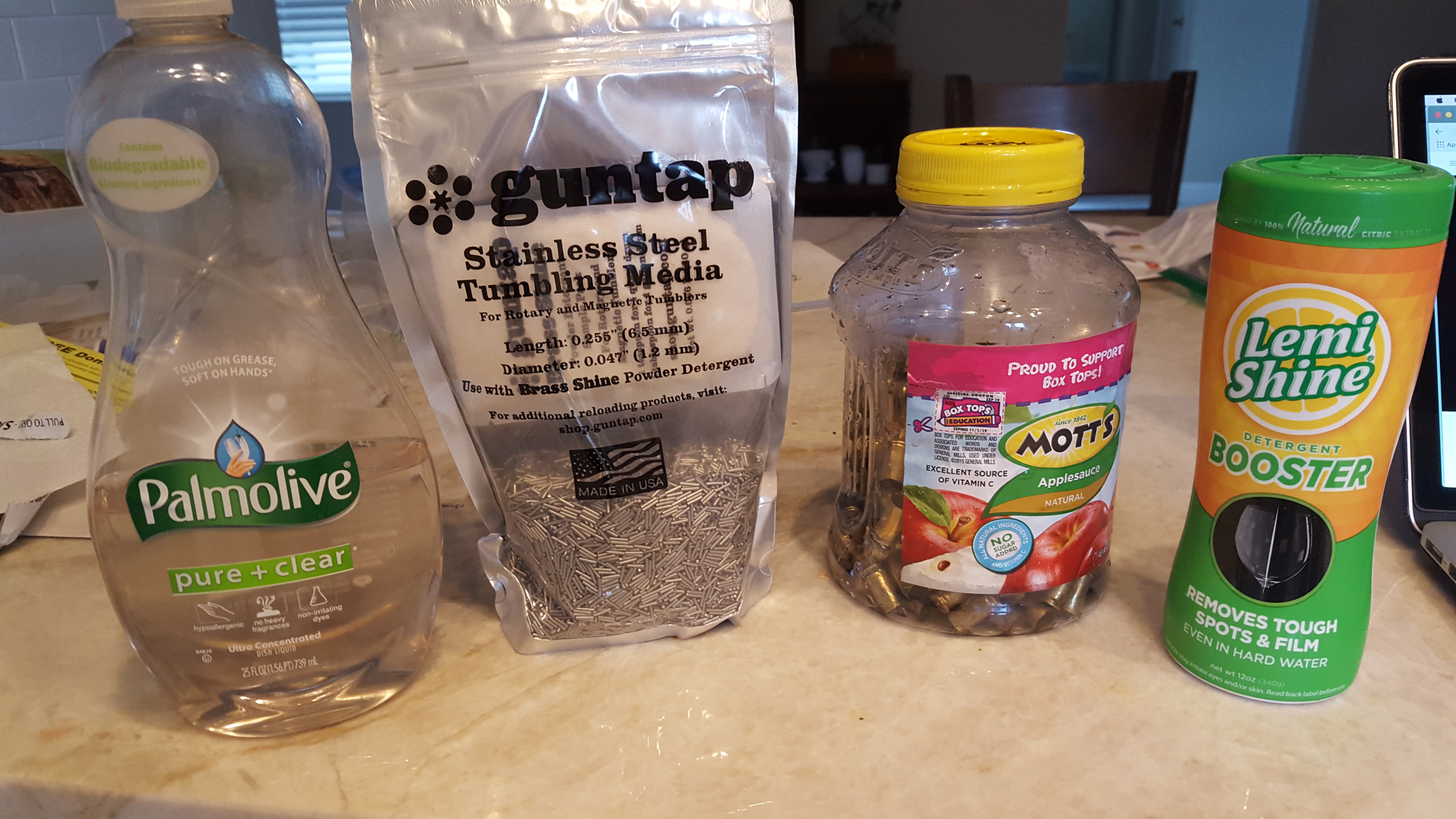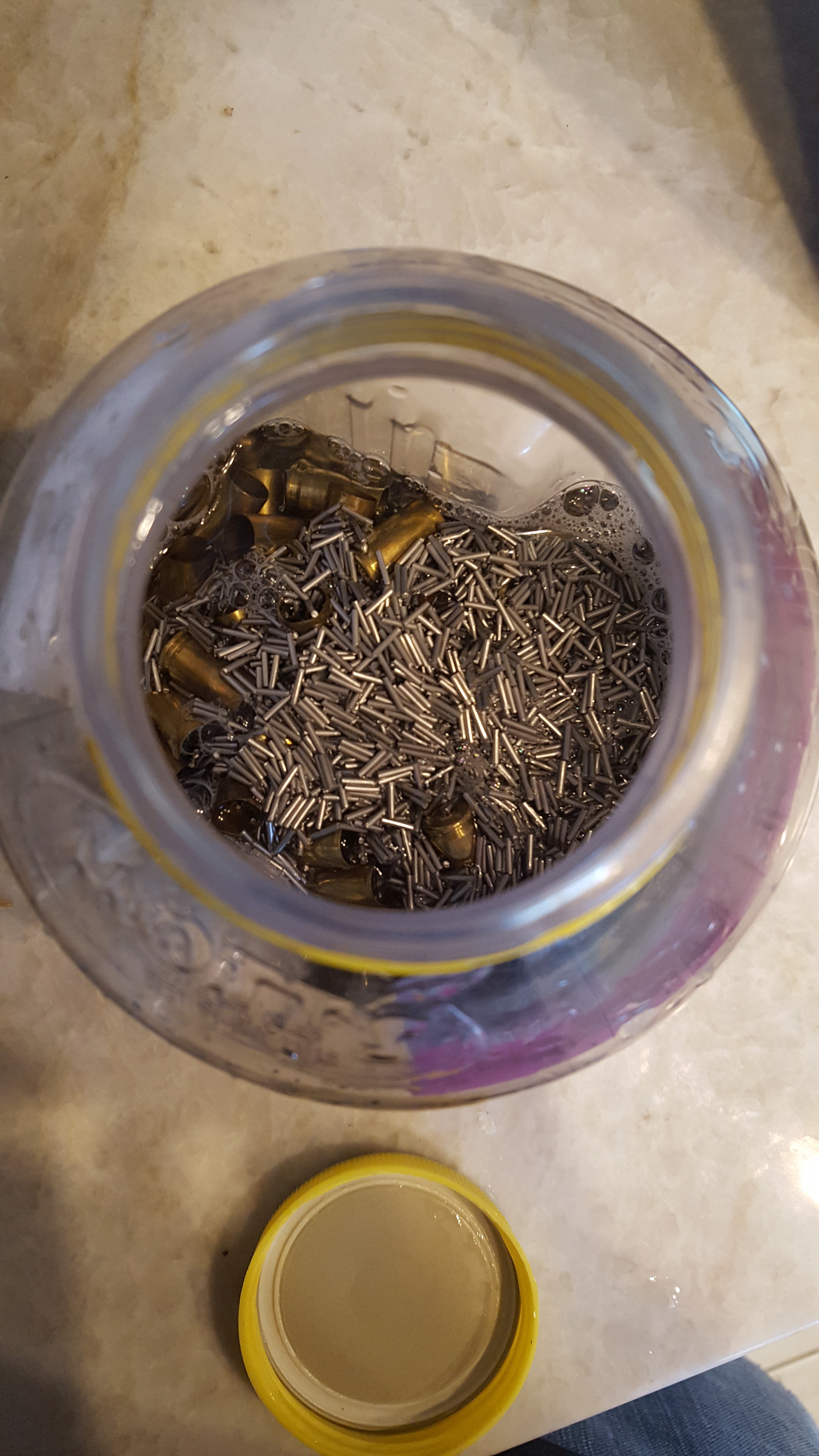 I moved the apple sauce to another container and rinsed it out (bonus: eating apple sauce while working!). Then I put 200 pieces of dirty brass, 1/4 teaspoon of Lemi Shine, once squirt of dish soap, 1/2 cup of stainless steel media, and covered it all with water. I threw it on the tumbler and let it go for about an hour. Besides the rubber splicing tape wearing off, the main drive shaft also worked its way towards the side that the pulley is on. I’ll need to make some kind of keeper for the shaft to hold it in place without binding somehow.