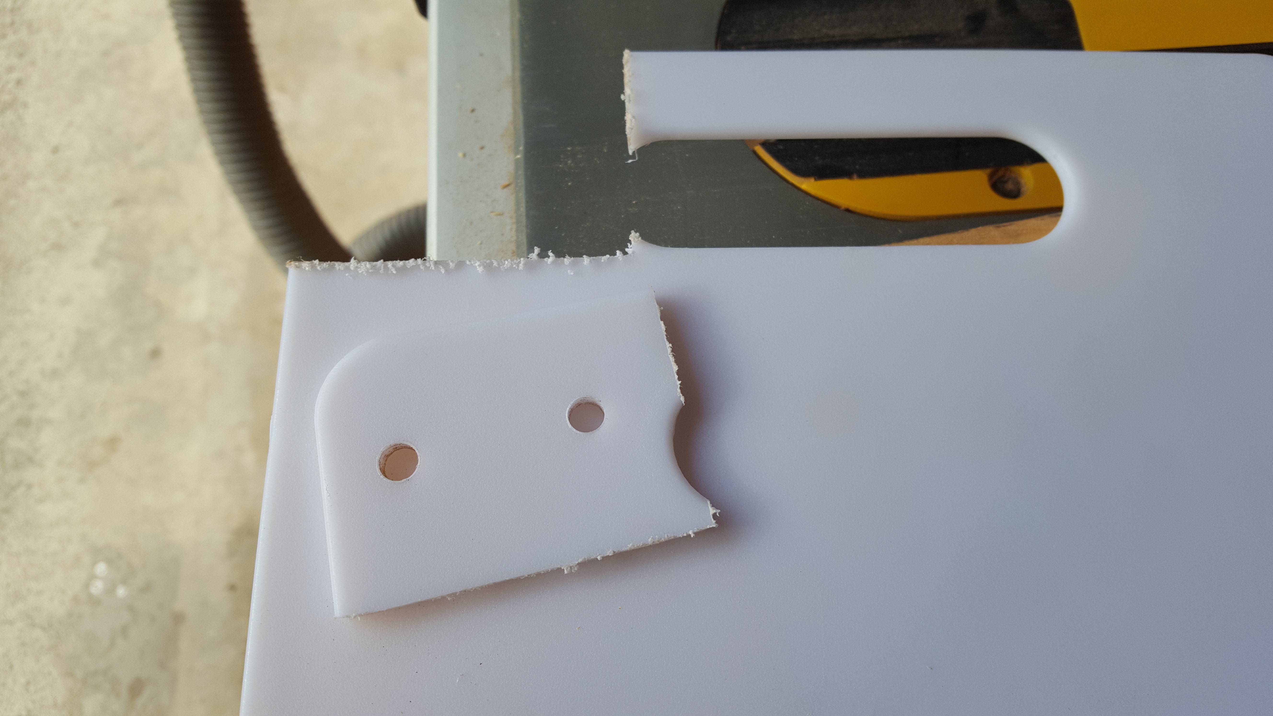 Using 3/4 plywood I screwed two supports into a plywood base. A single 3′ long 1/4″ zinc covered steel rod was cut in half and two sets of matching holes were screwed into the supports for it. I made those holes larger than needed and cut some small strips out of a plastic cutting board with 1/4″ holes as bearings, and screwed them over the holes.
