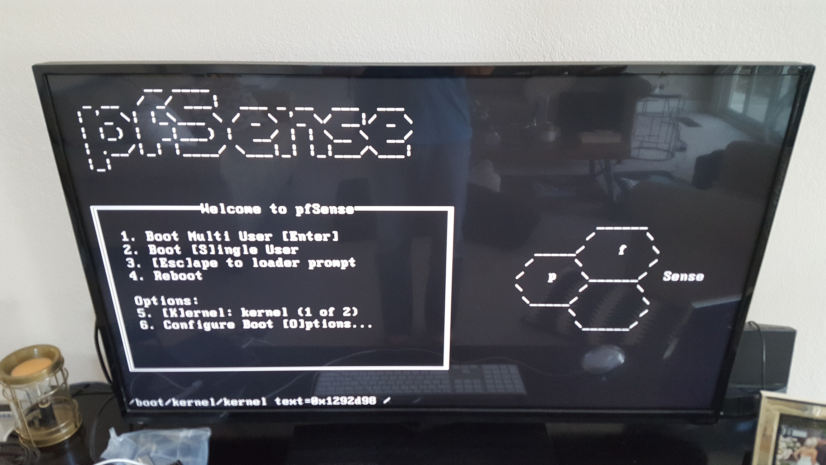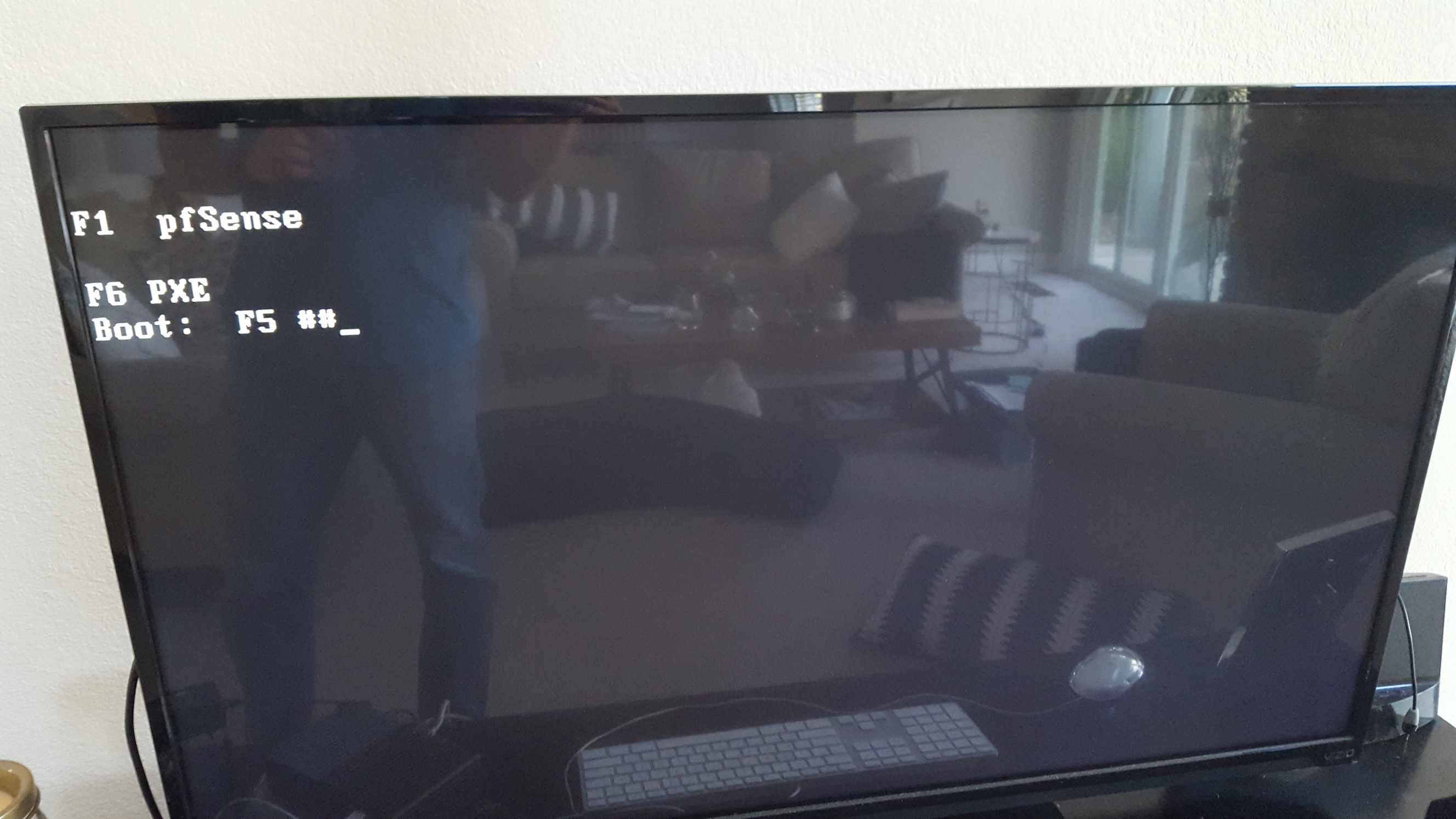 I made a USB stick install of pfSense and inserted it into an open port and booted it up after connecting to my HDMI TV. The BIOS needed me to hit F5 to boot from the USB.