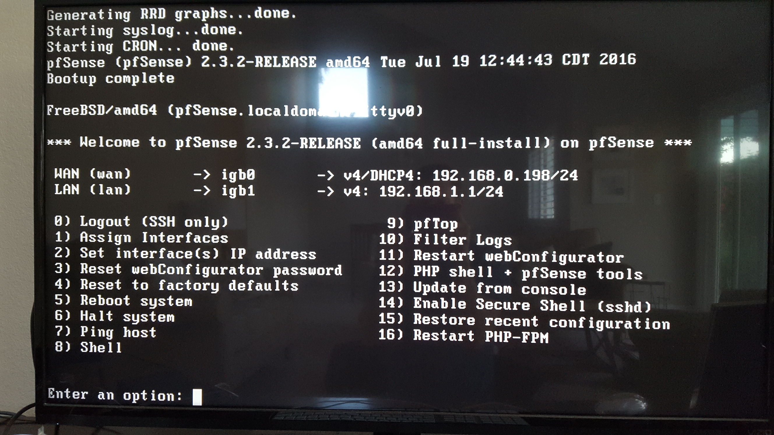 Before you can begin, you need to assign interfaces. This is option 1 from the main screen and it will ask you what port will be used for WAN (usually your ISP’s modem) and what will be LAN (your private local network). You can also assign OPT (optional) interfaces if you like, or just wait until you get into the web GUI to do that. For a small home network you probably don’t need to worry about it, but you’re welcome to explore and try it out! If you don’t know what port is what on your new device (I didn’t and the port numbers don’t seem to match what I thought they would), you can unplug your cables, have it automatically recognize the port, and plug in the cable when it’s ready. I recommend this since I didn’t know if the ports went in order (surprise surprise, they don’t).