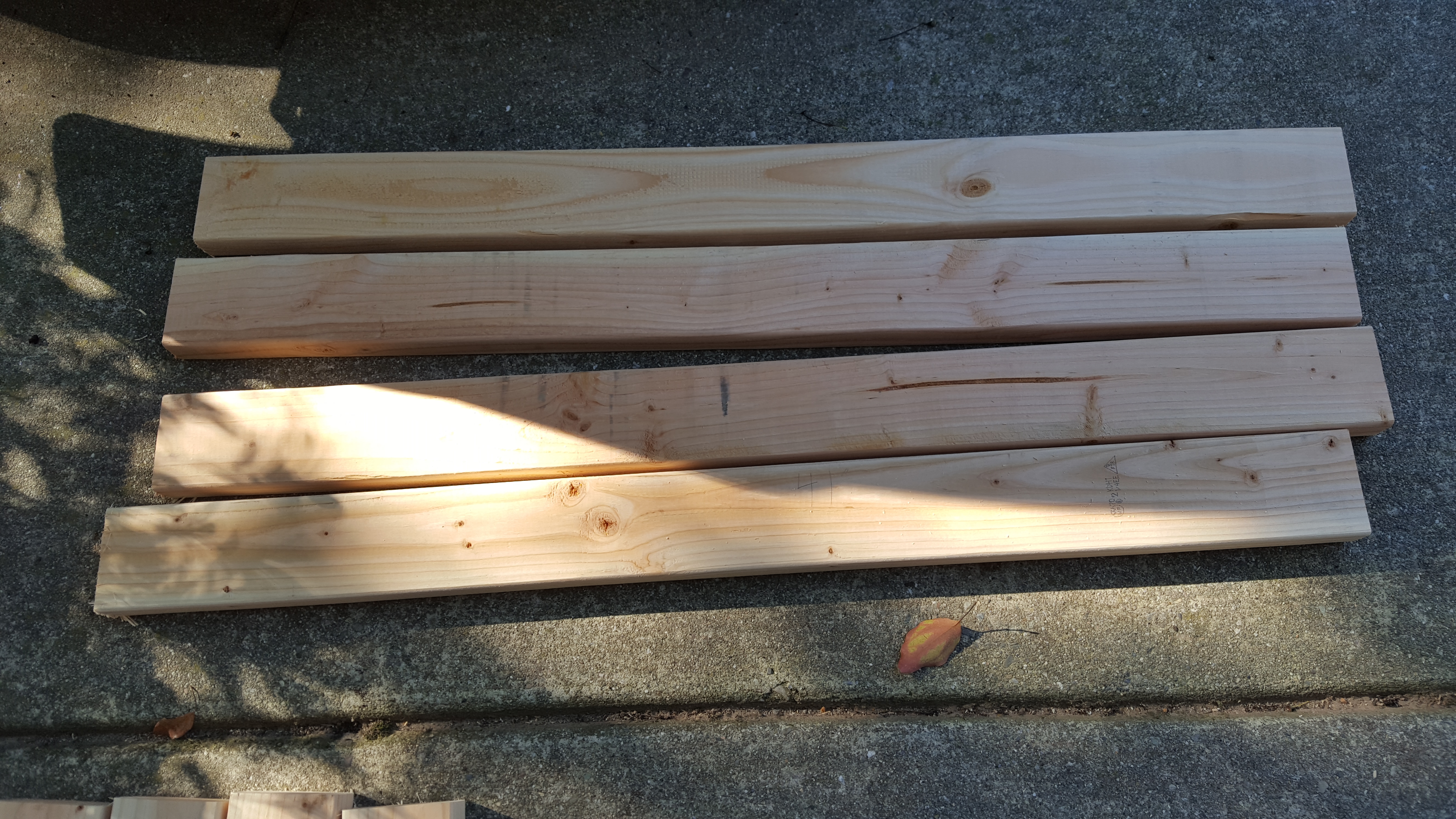 I measured and cut the 4×4 legs at 41 3/4″, the short stretchers and short aprons at 17″, and the long stretchers and long aprons at 41″. I needed four of each to get started.