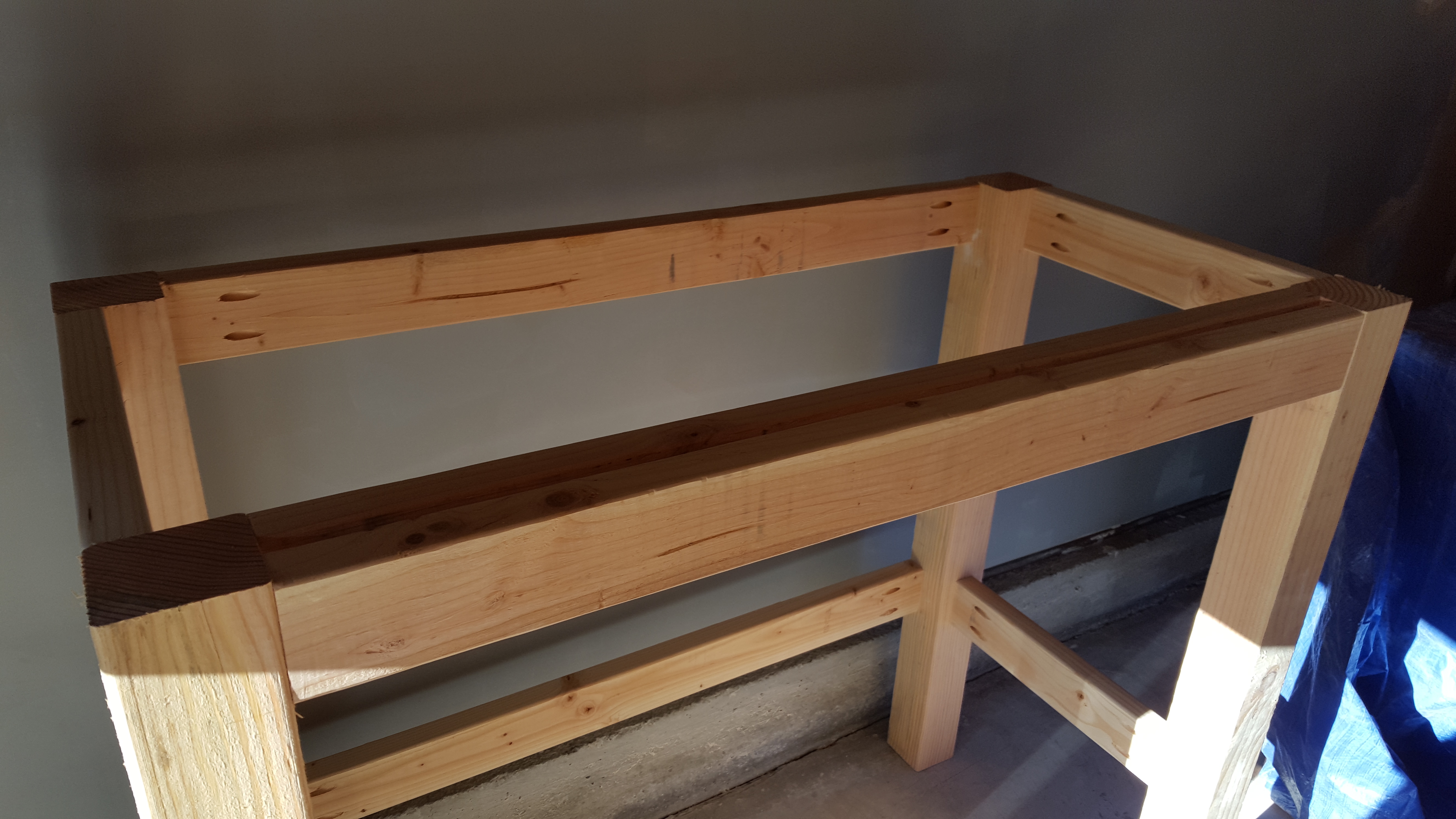 The legs were 4x4s for stability with the rest of the frame being 2x4s and assembled with pocket screws. Pocket screws are fast, easy, and hold plenty strong for this.