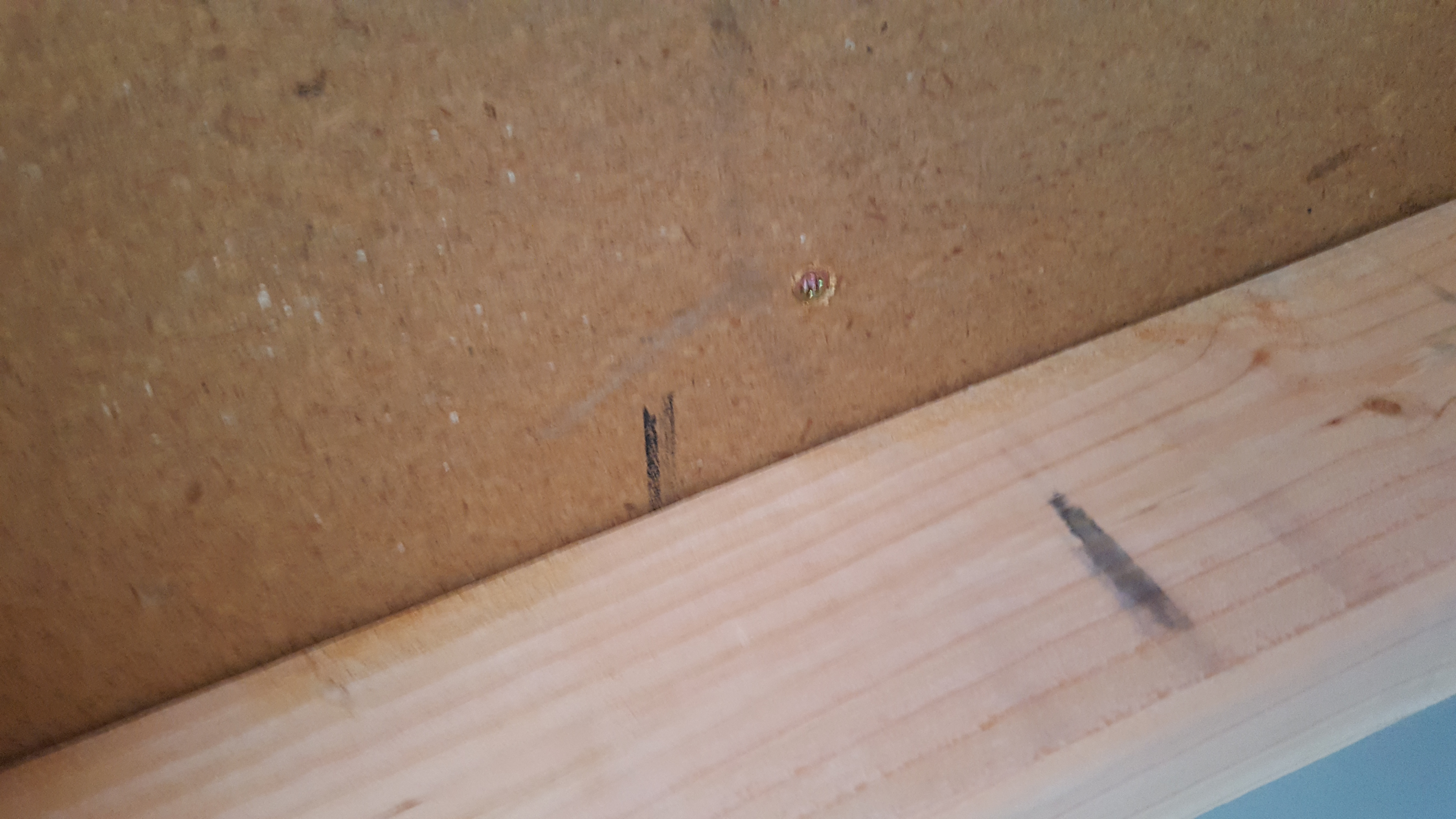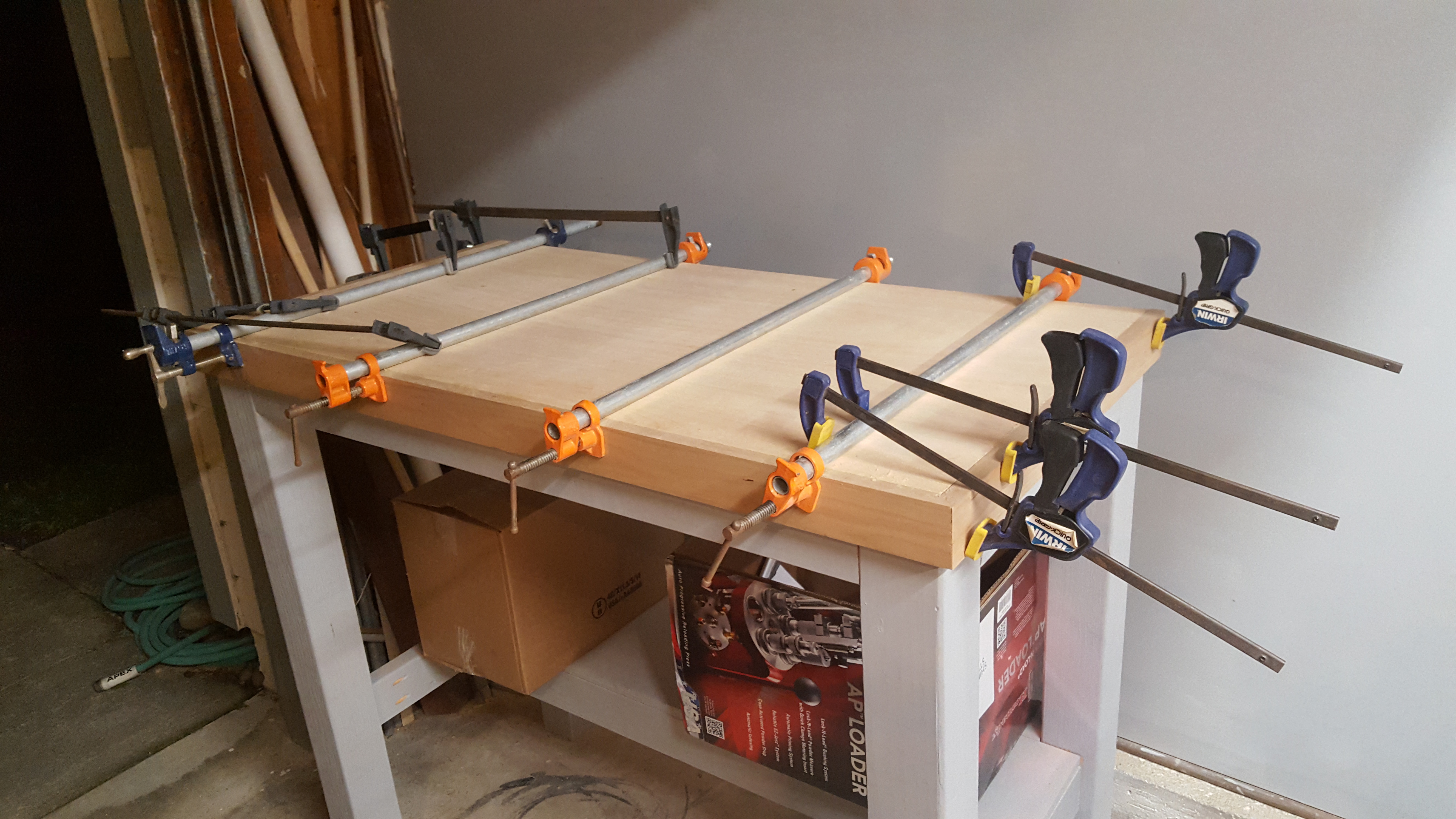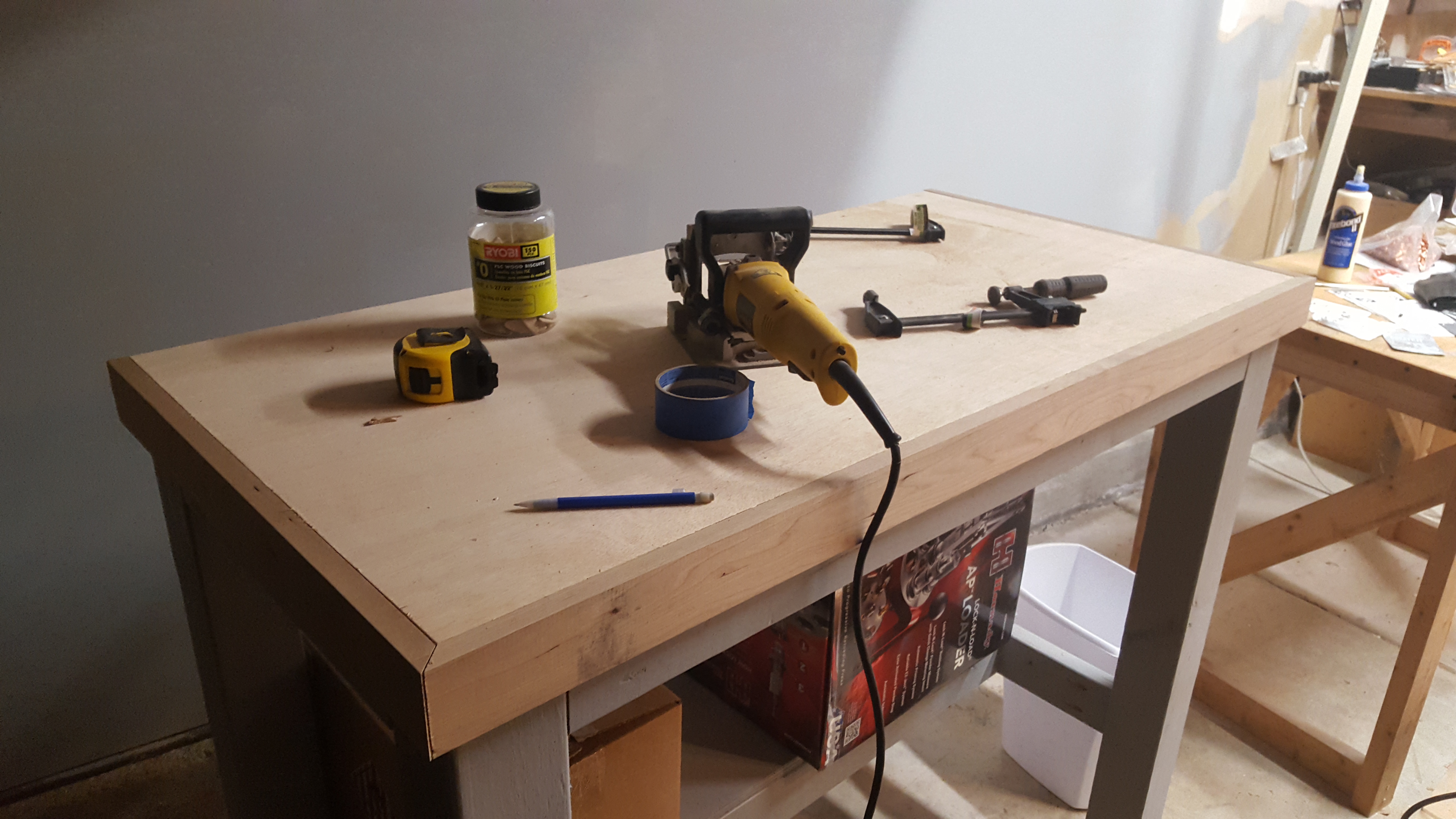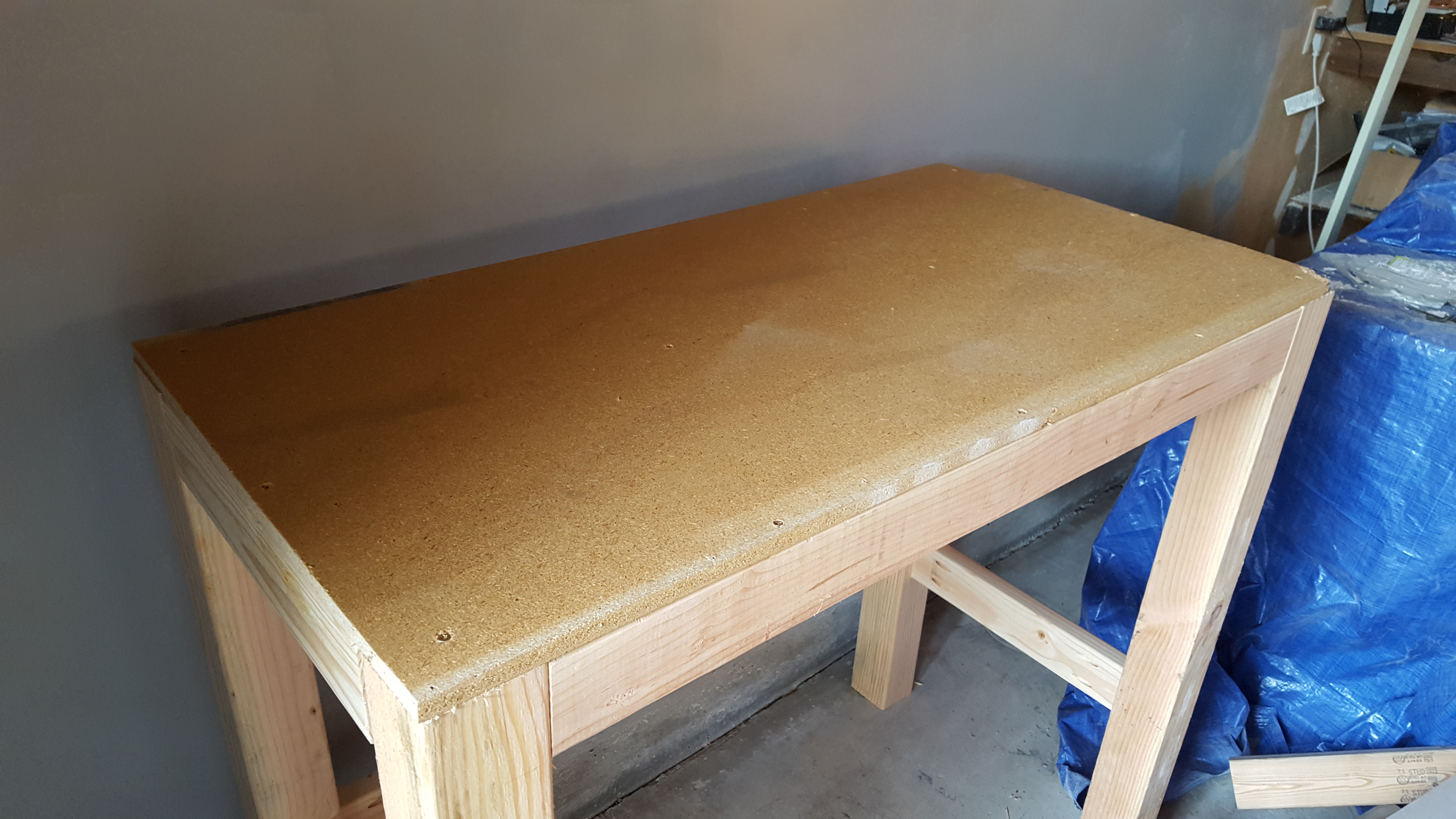The top is in two parts: the first layer is some leftover 5/8″ particle board that had been used as a shelf, and the top is 3/4″ Sande Plywood that I had leftover from another project.