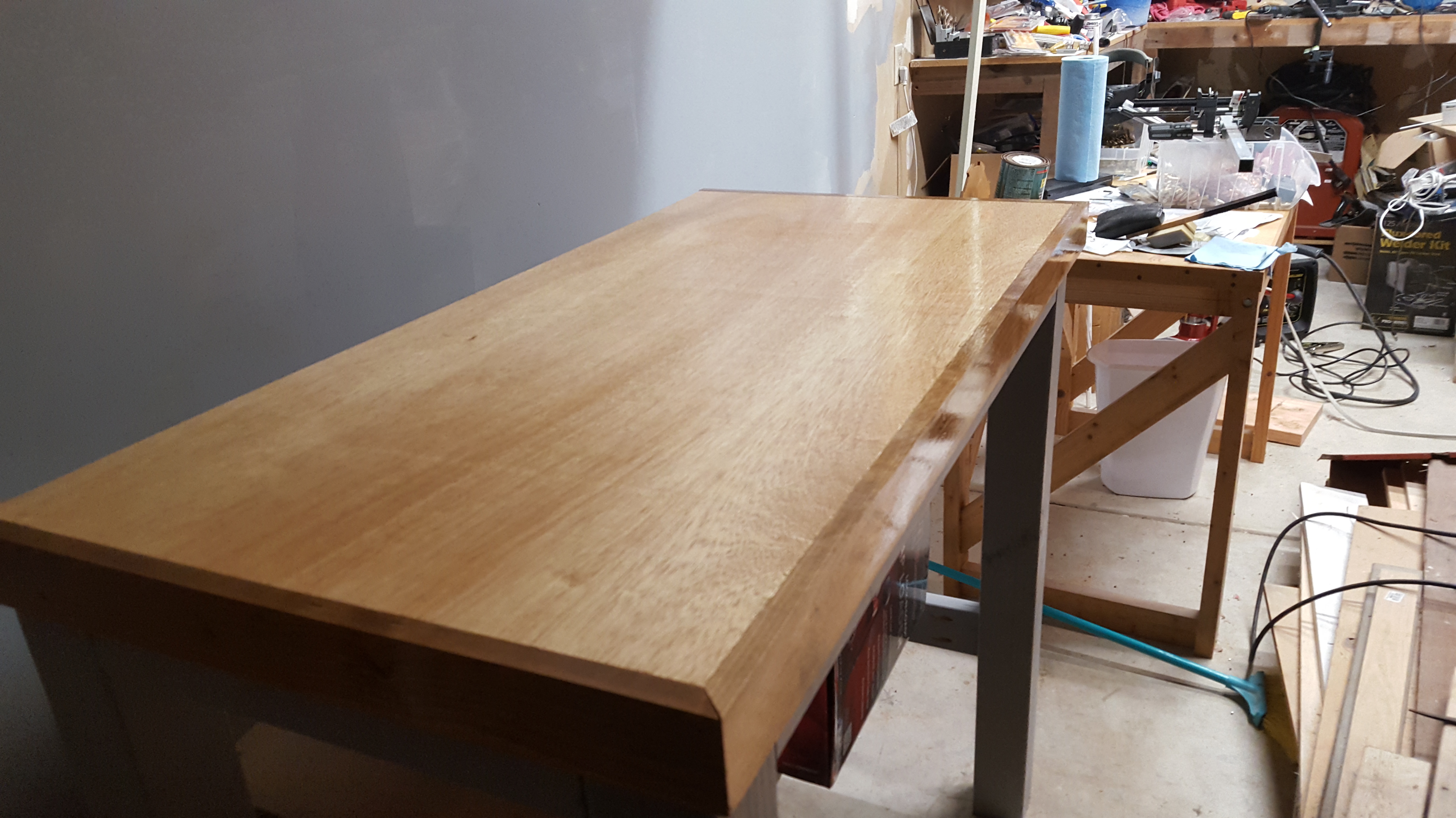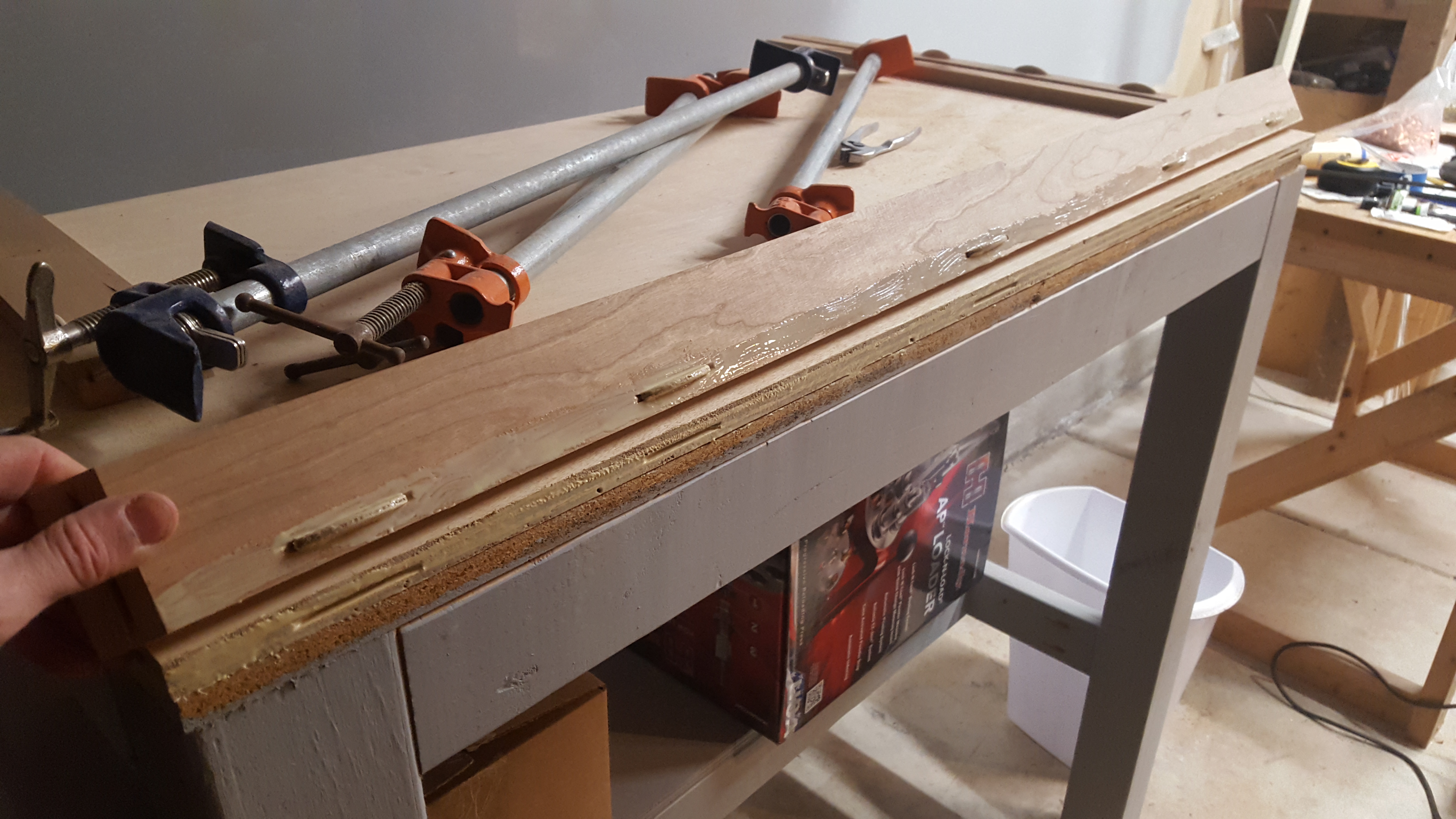 I’m pretty pleased with how it turned out, but there are a few small gaps, especially on the corners, where the top meets the Cherry. If this was a piece of furniture, I would have taken more time, but since it’s essentially a glorified workbench, I am satisfied with the results.