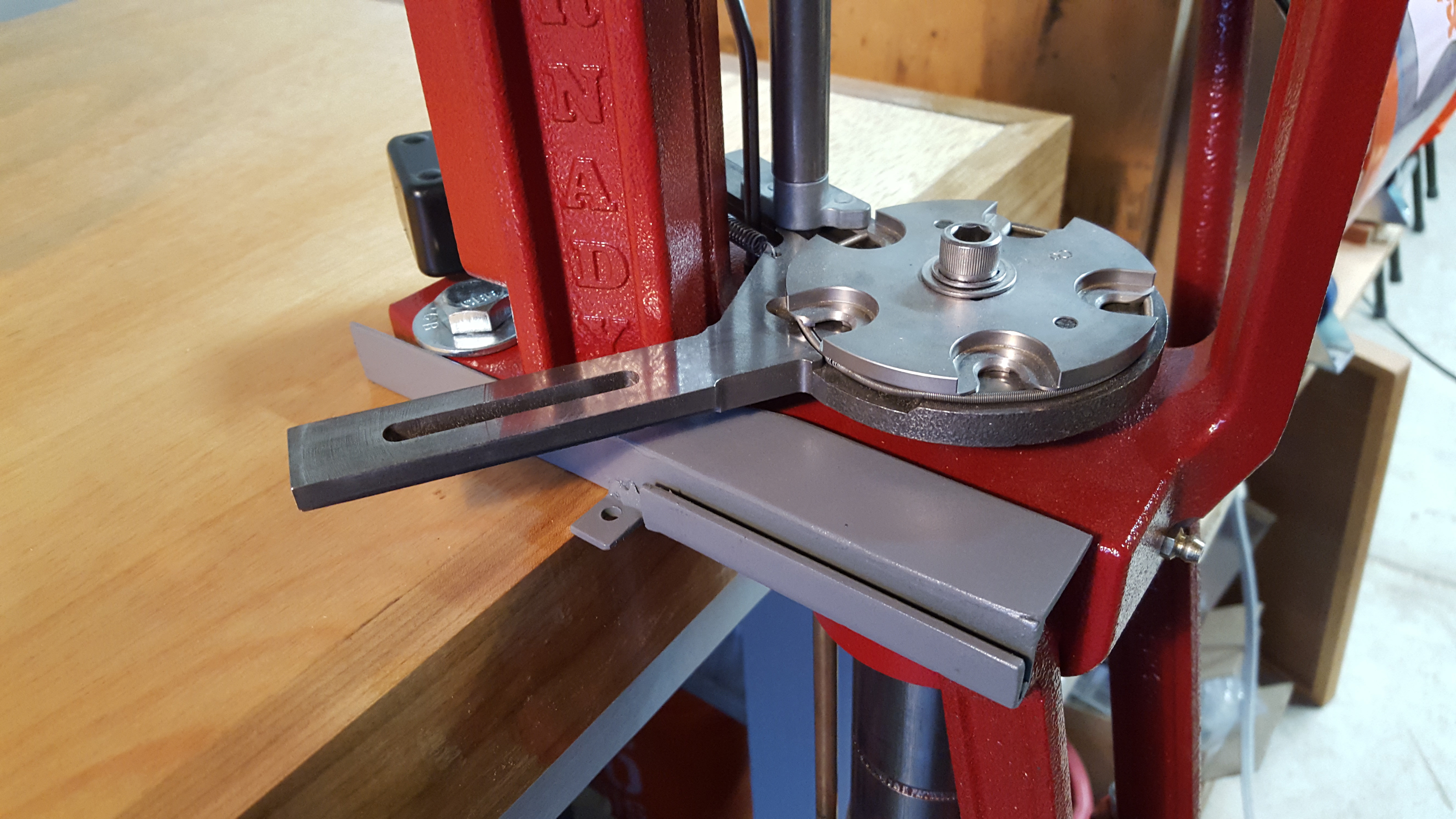 The last thing to do is to ruin the top by drilling some holes for the press to be mounted to. They are 1/2″ and I mounted the press on top of my homemade main bracket that works with the case feeder I am working on.