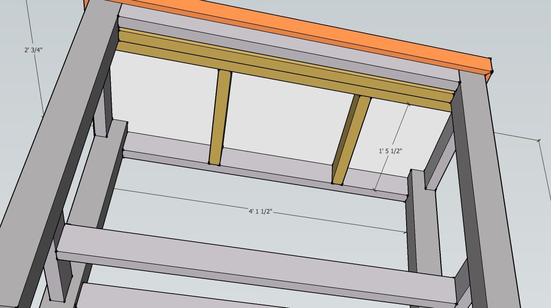 Two supports were cut at 17 1/2″ and spaced evenly in the middle. These should provide enough support in the middle of the bench top.