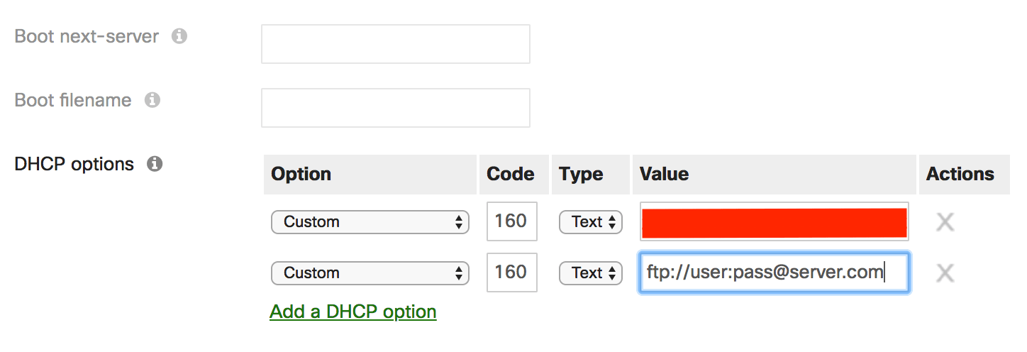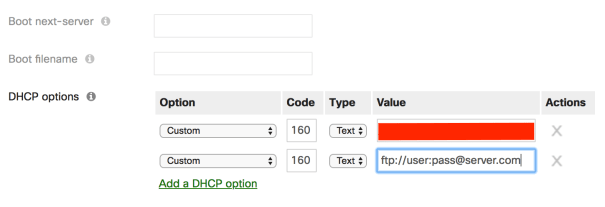 I started installing a new phone system for work. It’s replacing the Comcast phones with a FreePBX server and new Polycom phones. The great thing about this setup is that you can provision a large number quickly as long as you have the system setup correctly beforehand. The only real difficulty was that I was testing the phones at my house that uses pfSense but my work uses a Meraki firewall for DHCP in one location and a Mac OS X Server in another and all three of these have different ways of setting DHCP options. This is how to configure all three systems to send DHCP Option 160 to your phones with the ftp (or tftp/http) address and credentials. This does not explain setting up your FreePBX system or Endpoint Manager. For that I suggest checking out Crosstalk Solutions YouTube series FreePBX 13 Made Easy!