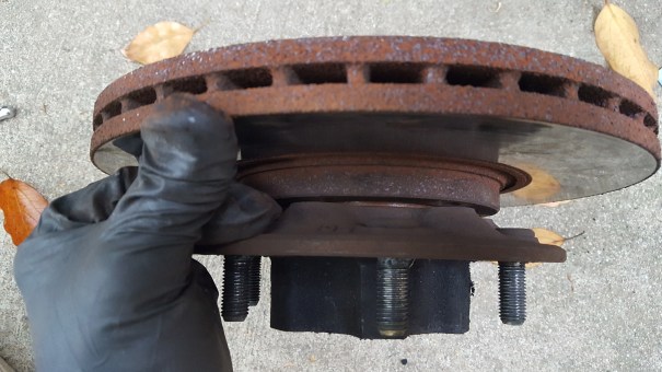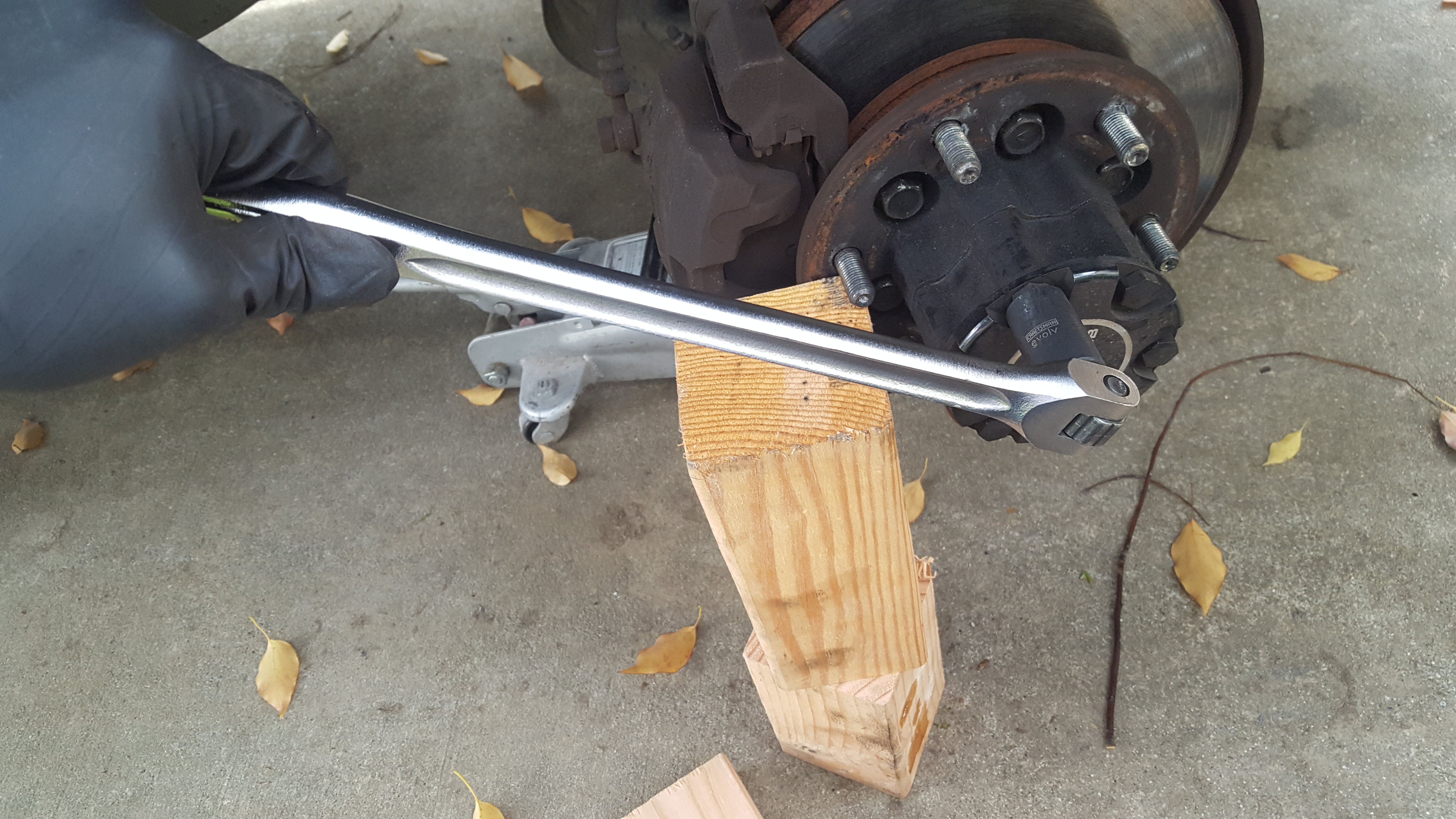 Remove the caliper mounting bracket’s two bolts and hang the whole brake assembly out of the way without twisting the brake line or dislodging the brake pads. They are torqued to 103-126 ft-lbs so bring your A-game