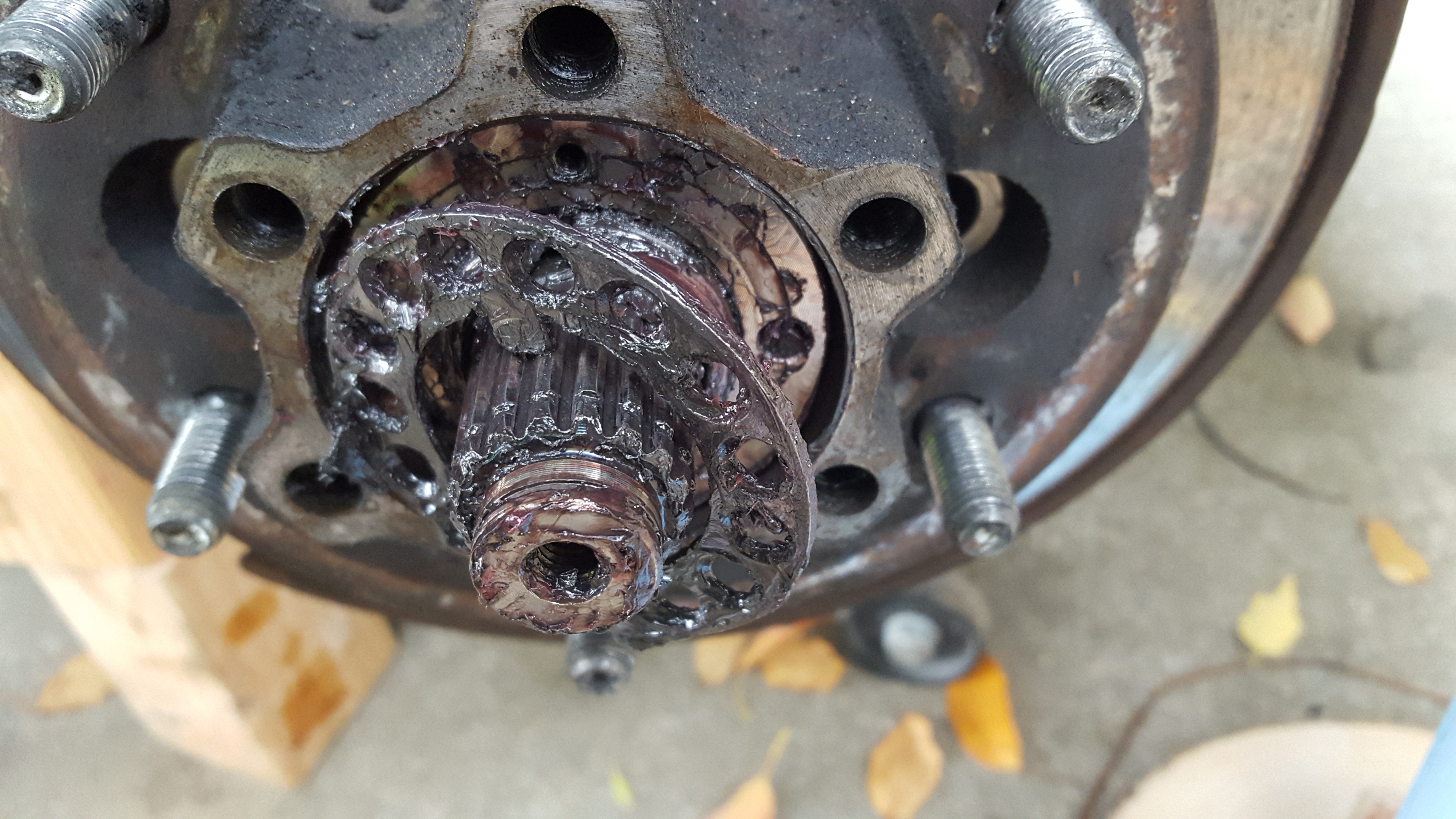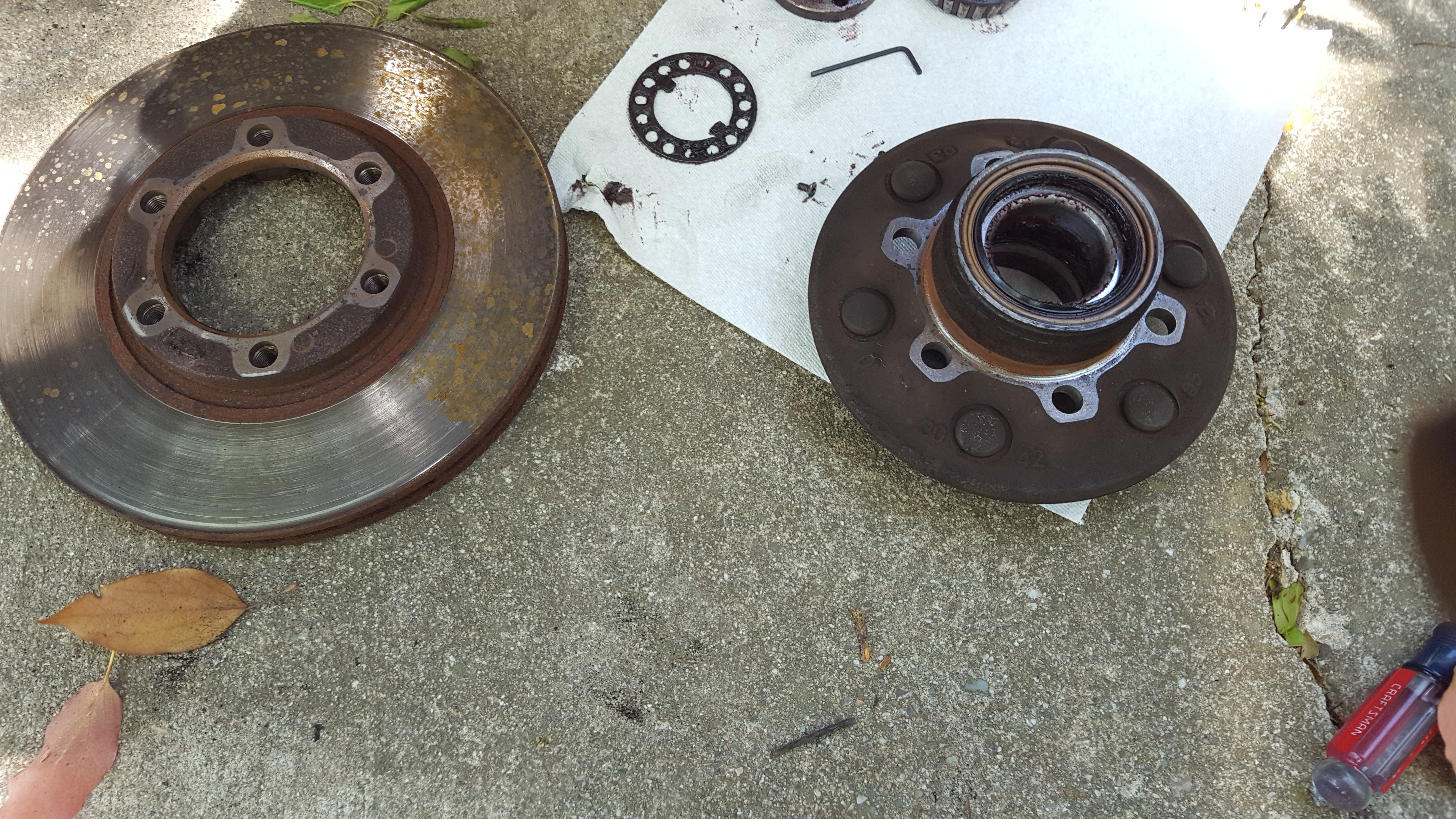Using some blocks to keep the wheel from turning, break free the hub to rotor bolts (only if you are replacing the brake rotor as well)Break free the hub housing assembly boltsRemove all the boltsAnd pull the housing assembly off to reveal the auto hub (the manual calls it the “Drive clutch assembly”)Inside you will see a snap ring that is holding the hub on. Here you can see that I already pried it out of it’s grooveRemove the auto locking hubPull off the inner cam (sometimes it comes off with the hub assembly)Remove the three small screws holding the retaining ring (or lock washer in the service manual). I replaced mine with stainless steel allen screws but the OEMs are Phillips head. Look for “Machine screw flat – Phillips 4mm x 8mm”Pull out the retaining ringRemove the hub nut by unscrewing it. A screwdriver works if you tap it a few times, or use the tool described belowFinish unscrewing the hub nutThen pull out the outer bearing that should just be sitting thereAnd pull off the hub assemblyIf you are replacing the rotors, separate the hub from the rotor, otherwise you can leave them assembledThe hub and rotor pulled apartWith a seal puller, remove the rear grease sealOnce it’s out, pull out the inner bearing