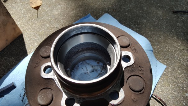 Place the inner bearing (the larger one) in firstPlace the new seal squarely over the top and drive it in. I like to use a small section of 4×4 and place a thick paper towel over it so nothing falls into the hubReattach the hub to the rotor if you removed it earlierSlide the assembly back onAfter packing the smaller outer bearing with grease, slide that into the hub as well