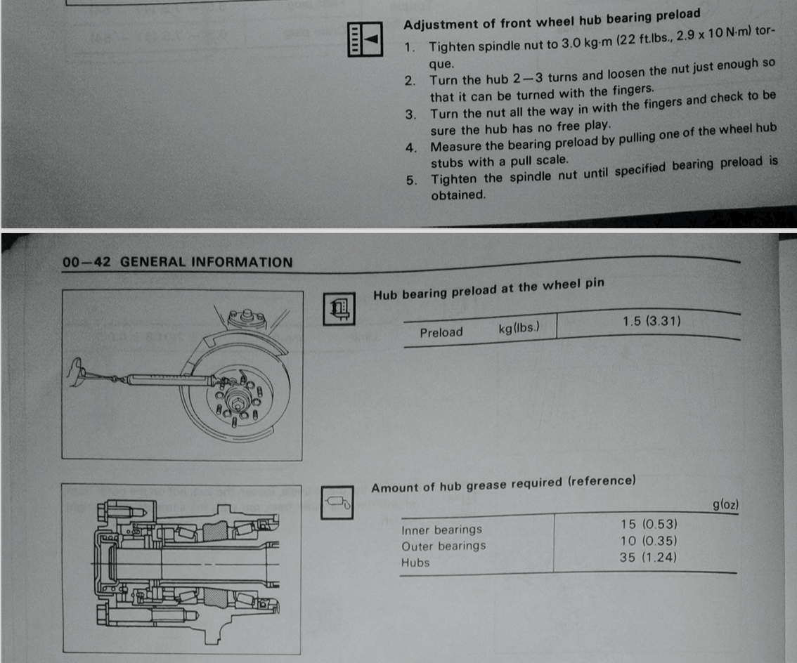 Pages from the manual for the amount of grease in the hub and the bearing preloadNew Ford socket about to get cut upA Ford 4WD nut with two of the prongs ground offAnd the other two prongs ground downTighten the hub nut to 22 ft-lbs, spin the wheel a few times, back it of, hand tighten the hub nut againTighten it until the preload with a spring scale reads 4.4-5.5 ft-lbs with new bearings and seal or 2.6-4.0 ft-lbs with old partsLine up the retaining ring with the screw holes on the hub nut. The holes are aligned slightly differently if you spin it 180 degrees to line up the holes. Otherwise, adjust the hub nut as little as possible to get it lined upReinstall the three small screws to hold the hub nut in place