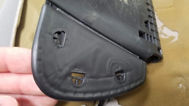 Since the ears on the end had snapped their live hinges, I used two strips of the new headliner material and contact cement to reattach them